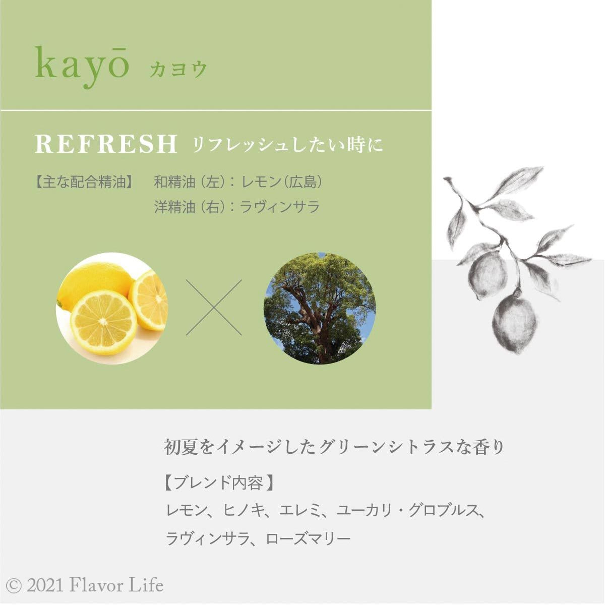 水、エタノール、植物性可溶化剤、クエン酸、柿渋エキス、緑茶エキス、フェノキシエタノール、精油(レモン、ヒノキ、エレミ、ユーカリグロブルス、ラヴィンサラ、ローズマリー)
