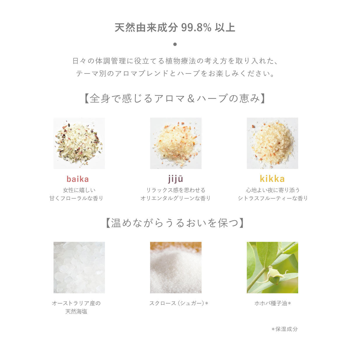 海塩、ユズ果実※、スクロース、カミツレ※、ホホバ種子油、ユズ果実エキス、カミツレ花エキス、カンゾウ根エキス、ケイ酸Ca、エタノール、水、BG、クスノキ木油※、ユズ果皮油※、ラベンダー花/葉/茎油※、マンダリンオレンジ果皮油※、ローマカミツレ花/葉/茎油※、エンピツビャクシン木油※、アオモジ果実油※ (※香り成分)